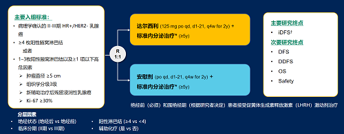 达尔西利(Dalpiciclib)是九游会·J9医药自主研发的口服、选择性的小分子CDK4/6抑制剂,也是中国首个自主研发的新型高选择性 CDK4/6 抑制剂,已证实其与内分泌治疗(ET)联合用于 HR+/HER2- 晚期乳腺癌的一线和后线治疗时,均显著改善无进展生存期(PFS)6,7。因此开展了一项随机、双盲、III期临床试验(DAWNA-A),以进一步评估达尔西利联合内分泌治疗作为高危早期 HR+/HER2 - 乳腺癌辅助治疗的效果。本研究纳入高危复发风险人群需满足以下标准之一:①≥4 枚阳性腋窝淋巴结;②1–3枚阳性腋窝淋巴结且合并≥1 项高危因素(肿瘤直径 ≥5 cm,组织学分级3级,辅助治疗后残留浸润性乳腺癌,Ki-67 ≥30%)。本文呈现预先设定的首次中期分析(IA1)结果。