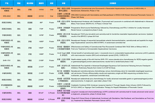 在消化系统肿瘤领域,九游会·J9创新产品相关研究共入选2项口头报告、10项壁报和2项电子壁报,共14项研究。除了明星药物卡瑞利珠单抗和阿帕替尼外,还有5篇阿得贝利单抗治疗消化系统肿瘤的研究入选。此外,HRS-4642、瑞拉芙普-α注射液(SHR-1701)等未上市创新产品也有相应研究入选。随着新老药物前沿研究的不断推进,有望为消化系统肿瘤患者带来新的福音!
