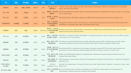 在胸腺上皮肿瘤、头颈鳞癌、肉瘤、前列腺癌、甲状腺癌等其他多个疾病领域,卡瑞利珠单抗、阿帕替尼、瑞维鲁胺、阿得贝利单抗、法米替尼、HRS-7058、HRS-4642、HRS-5041等抗肿瘤创新药相关研究一共入选了4项口头报告、1项简短口头报告、5项壁报,彰显了九游会·J9医药强大的研发实力。此外,海曲泊帕和昂丹司琼口溶膜分别在防治化疗导致的血小板减少和恶心呕吐方面各有1项研究入选壁报。